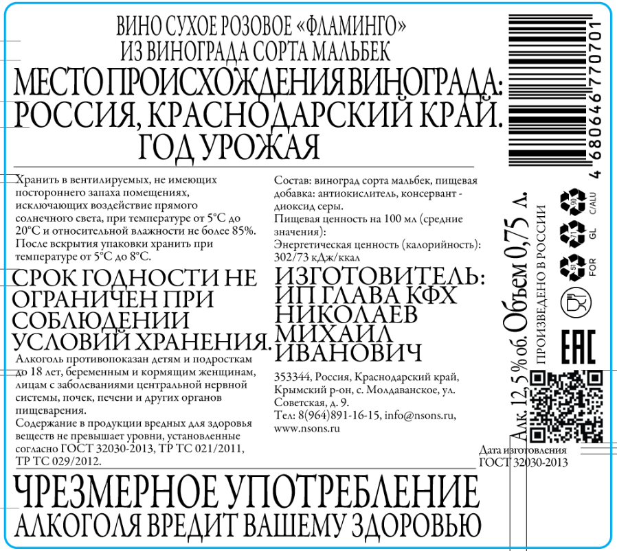 Вино Николаев и сыновья Фламинго розовое сухое, 0.75л