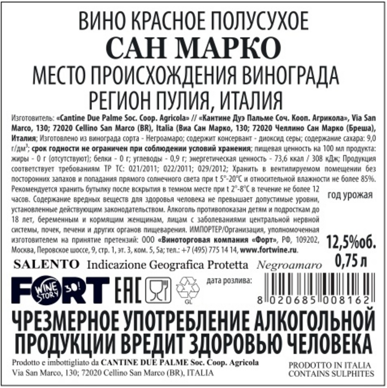 Вино San Marco Cantine Due Palme красное полусухое, 0.75л