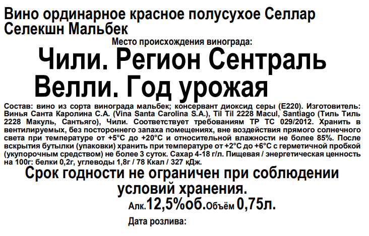 Виноград сорта Мальбек, пищевая добавка - консервант, антиокислитель диоксид серы.