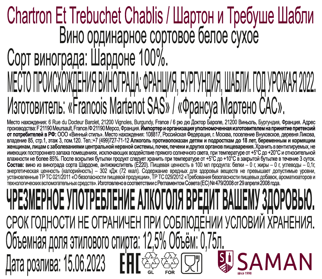 Вино Sharton & Trebushe Chablis белое сухое, 0.75л