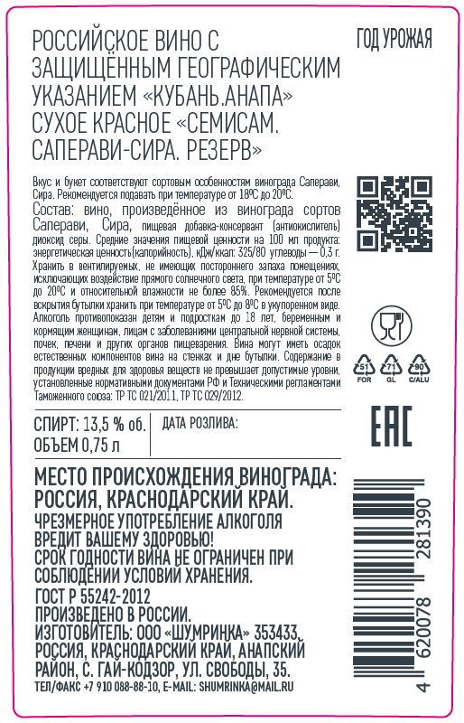 Насыщенный тёмно-рубиновый цвет. Аромат раскрывается тонами чёрных и красных ягод и оттенками специй. Округлое, сбалансированное вино с мелкозернистыми танинами, сочной кислотностью, фруктовым вкусом и длительным освежающим финишем. Ароматное, спелое и очень гастрономичное красное сухое вино, созданное из необычного бленда европейского сорта винограда Сира и кавказского Саперави. Виноград выращивается в географической зоне Кубань, на склонах горного хребта Семисам, недалеко от Анапы. Сбор урожая осуществляется вручную по достижении плодами полной зрелости. Незамедлительная переработка винограда проходит на винодельне, расположенной прямо на винограднике.