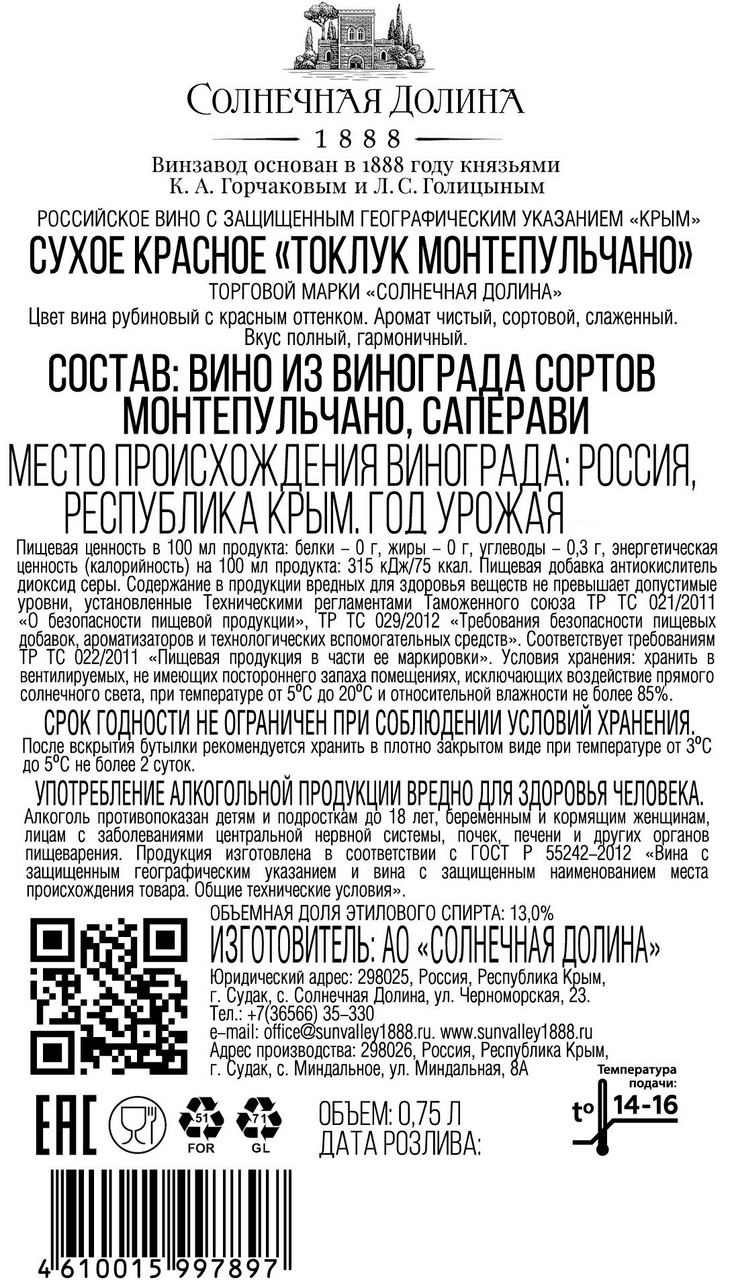 Российское вино с защищенным географическим указанием Крым сухое красное. Аромат яркий и достаточно сложный, с выраженными тонами черных садовых и лесных ягод, спелых фруктов, оттенками пряностей и специй, молочного шоколада и чернослива. Отлично сбалансированное вино гармонично сочетающее приятную свежесть с мягкой ягодной фруктовостью и бархатистыми танинами. Во вкусе дополнительно раскрываются тона спелых чёрных ягод и тона, присущие выдержанным винам - кожа, ваниль, шоколад. Послевкусие долгое и тёплое.