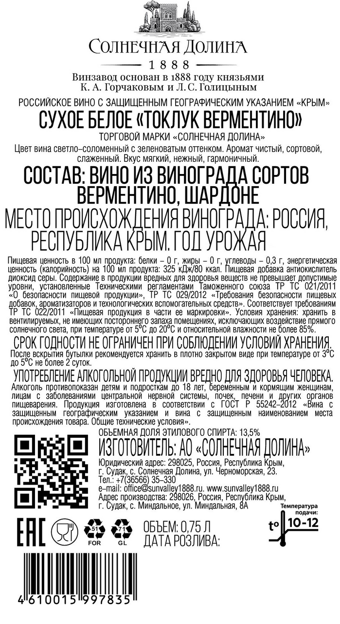 Вино Солнечная Долина Токлук Верментино белое сухое, 0.75л