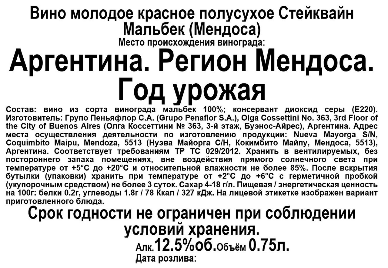 Вино Steakwine Malbec интенсивного гранатового цвета с ароматами красных ягод и ванили. Мягкое во вкусе с длительным послевкусием. Полусухое красное вино, изготовленное из винограда сорта Мальбек, который произрастает на виноградниках в Мендосе. Сбор урожая проводится по достижении ягод оптимальной спелости, винификация сусла проходит со строгим температурным контролем. Потенциал вина составляет 2-3 года.