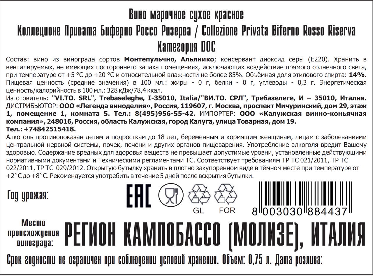 Вино Tombacco Biferno Rosso Riserva красное сухое, 0.75л
