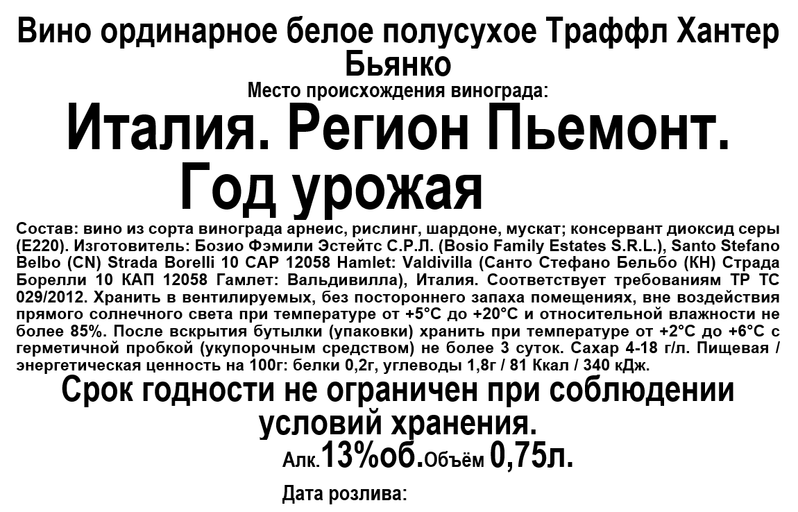 Виноград сортов Арнеис, Рислинг, Шардоне, Мускат, антиокислитель, консервант - диоксид серы.