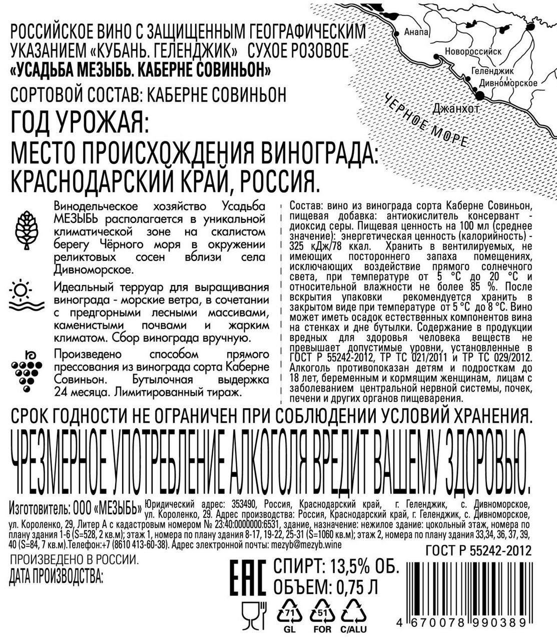 Вино Усадьба Мезыбь Каберне Совиньон розовое сухое, 0.75л