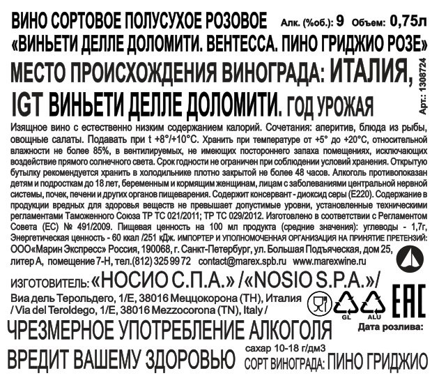 Виноград сорта Пино Гриджио, консервант - диоксид серы (E220).