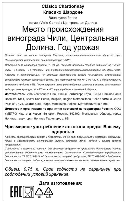 Вино Ventisquero Clasico Chardonnay белое сухое, 0.75л