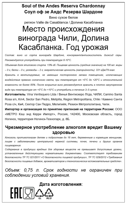 Вино Ventisquero Reserva Soul of the Andes Chardonnay белое сухое, 0.75л