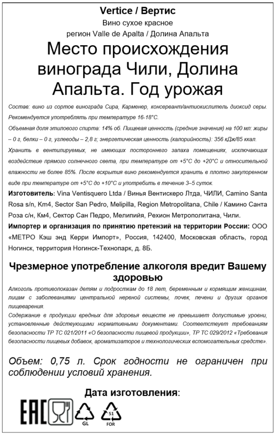 Виноградники с Карменере и Сира выращиваются на высоте 250-470 метров над уровнем моря в долине Кольчагуа в зоне Апальта, расположенной на юго-западе от Сантьяго. Вино выдерживается в бочках из французского дуба на протяжении 18 месяцев и еще 9 месяцев - в бутылках. Вино отлично сочетается с блюдами из красного мяса, дичью и зрелыми сырами.