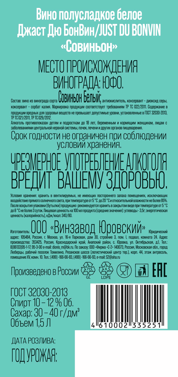 Вино Винзавод Юровский Джаст дю Бовин Совиньон блан белое полусладкое, 1.5л