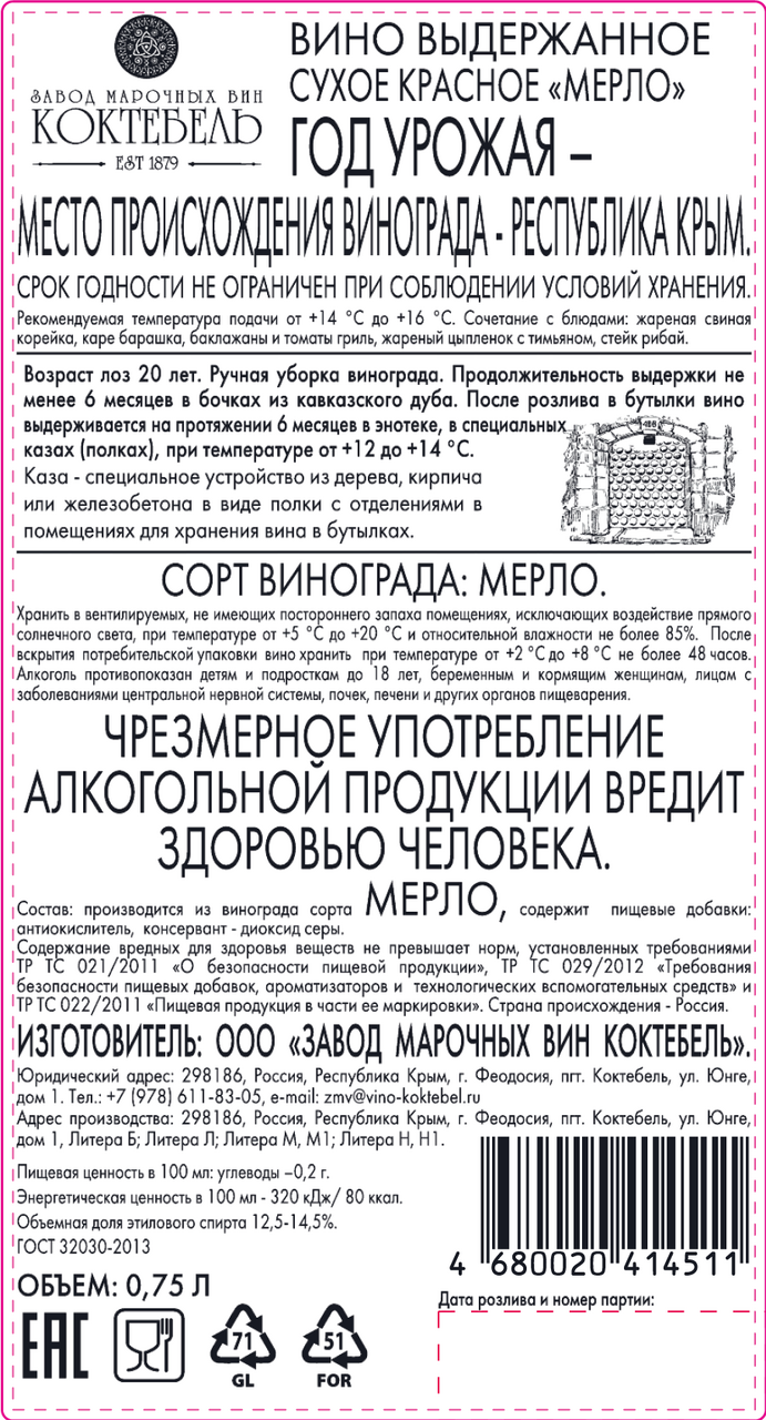 Вино ЗМВ Коктебель Каса Мерло красное сухое, 0.75л