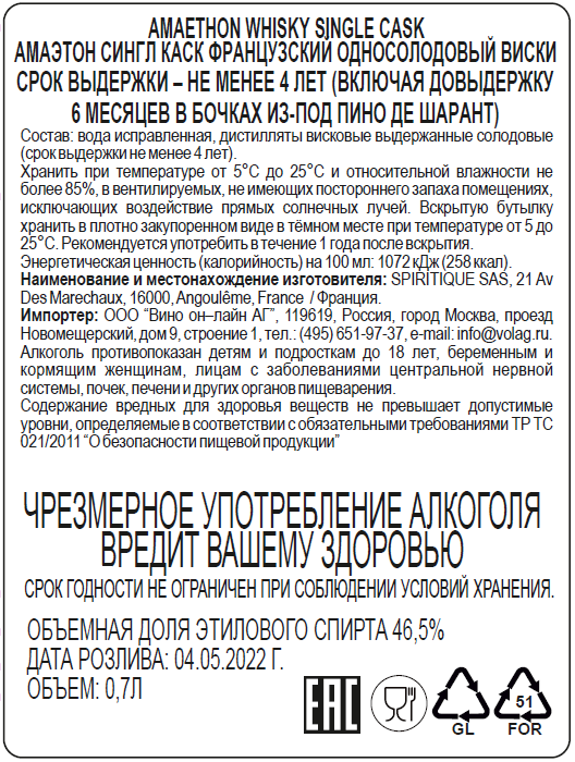 Французский односолодовый виски, названный в честь Амаэтона, бога земледелия в кельтской мифологии. Во Франции выращивали и перегоняли ячмень со времен галлов, создавая настоящую французскую традицию производства виски. Следуя этой традиции, Amaethon производится из ячменя уникального качества, выращенного во Франции, и выдерживается в бочках из мягких пород дерева на протяжении 3-х лет, что обогащает напиток исключительными зерновыми и хлебными нотками, а также наделяет мягким танинным шлейфом. Виски лучше всего подавать в чистом виде или со льдом, его можно использовать для приготовления коктейлей.