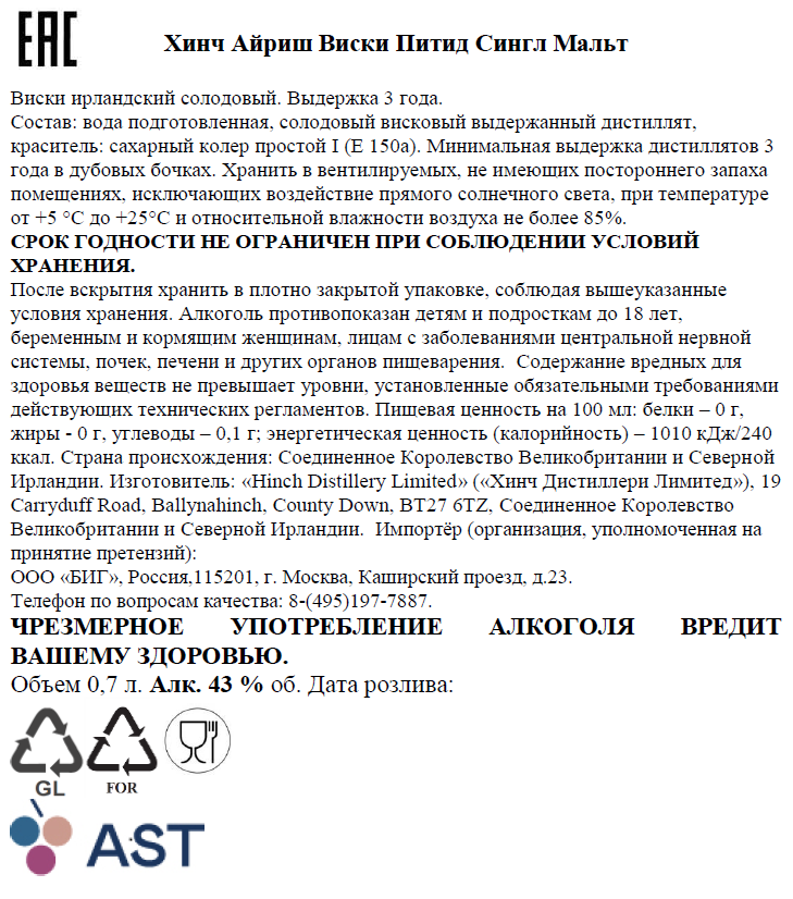 Виски ирландский Hinch Peated Single Malt, 0.7л