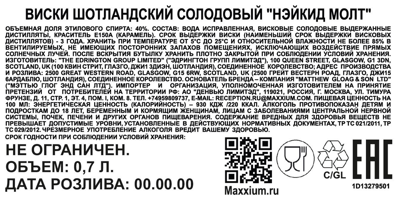 Naked Malt - премиальный солодовый скотч на 100% воплощает свой независимый дух, создав уникальную смесь лучших односолодовых спиртов, выдержанных в дубовых бочках из-под хереса Олоросо. Без добавления зерновых спиртов! Для выдержки Naked Malt используются бочки первого наполнения, их называют голыми (Naked), потому что в них никогда раньше не выдерживался виски. Это отличает Naked Malt от всех других солодовых скотчей. Подобная выдержка придает Naked malt роскошный aромат и вкус, который играет тонами ириски и печёных яблок, белого шоколада, кедра и пряности в послевкусии. У Naked Malt на 100% перерабатываемая бутылка, голый дизайн которой позволяет с первого взгляда оценить непревзойденное качество и цвет жидкости.