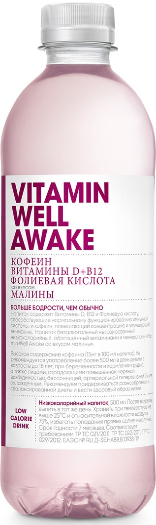Напиток витаминизированный Vitamin Well Awake со вкусом малины негазированный, 500мл x 12 шт
