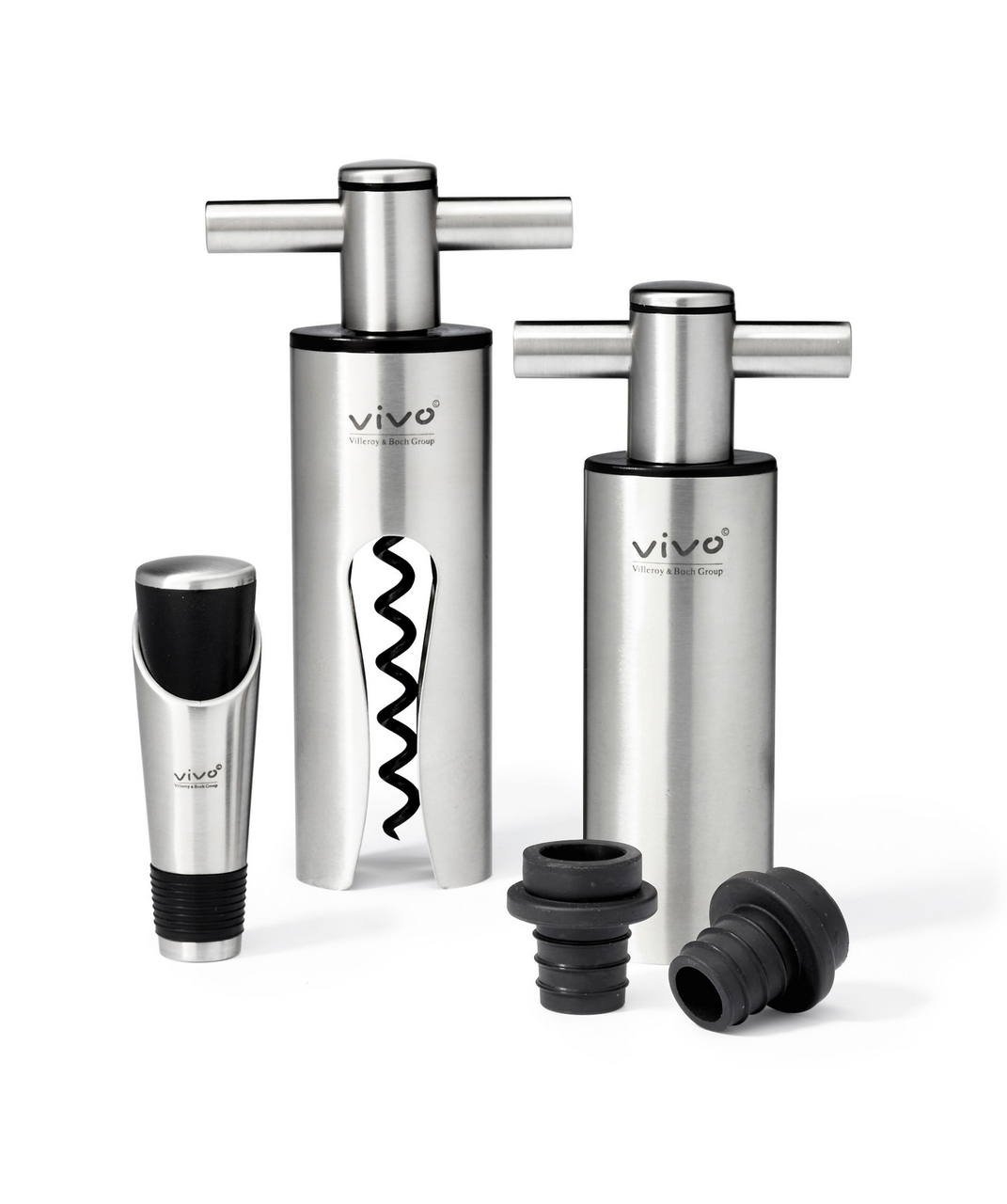 Состав набора: штопор, вакуумный насос, каплеуловитель, 2 пробки из нержавеющей стали минималист��чный дизайн
