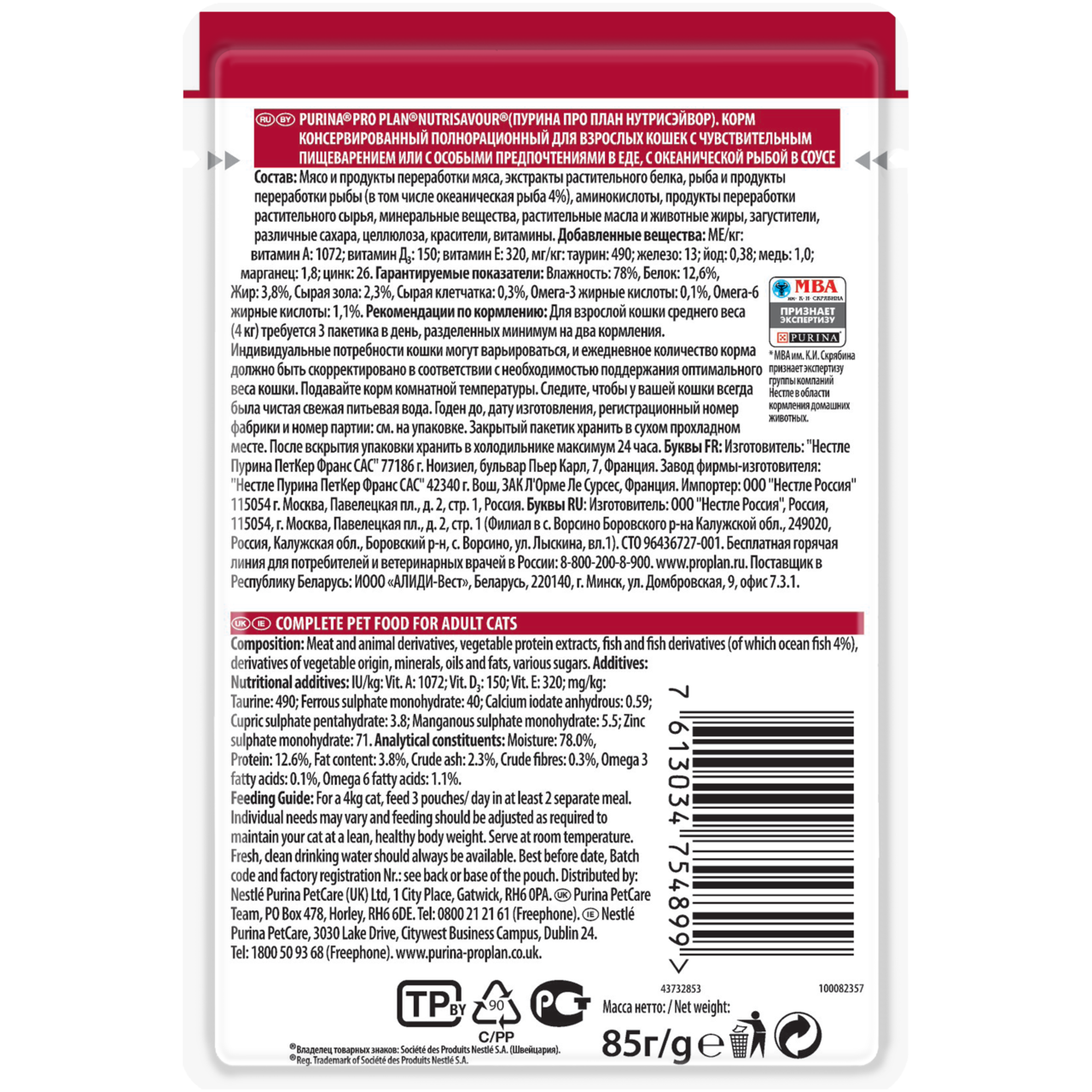 Влажный корм для кошек Pro Plan Паучи со вкусом натуральной рыбы, 85 г предоставляет собой сбалансированное питание, которое поддерживает здоровье питомца, его иммунную систему и работу всех внутренних органов. Данный вид корма рекомендуется также к употреблению кастрированным или беременным кошкам. Благодаря богатому минеральному и витаминному составу корм благотворно воздействует ��а функции мочеполовой системы, поддерживает оптимальные показатели веса. Входящие в состав антиоксиданты, витамин Е создают естественную защиту организма от внешних негативных факторов (микроорганизмов, вирусов, инфекций). В одном пауче содержатся нежные мясные кусочки, а пикантный вкус им придает аппетитное желе. Они подходят для взрослого питомца со средним весом 4 кг. При его кормлении рекомендуется использовать 4 пакета в сутки, разделенные на два кормления. Также необходимо следить за наличием свежей воды рядом с кормом. В состав продукта входят натуральные ингредиенты: мясо, мясные и рыбные субпродукты, индейка в количестве 4%, а также минеральные вещества. Витамины А, D3, железо, йод, медь, цинк и селен поддерживают здоровье костей, кожи, шерсти, пищеварительной, нервной, репродуктивной систем. Пакеты с кормом обладают компактными размерами, поэтому их можно брать с собой в поездку или путешествие вместе с питомцем. Хранить закрытый пауч рекомендуется в сухом прохладном месте, вдали от прямых солнечных лучей.