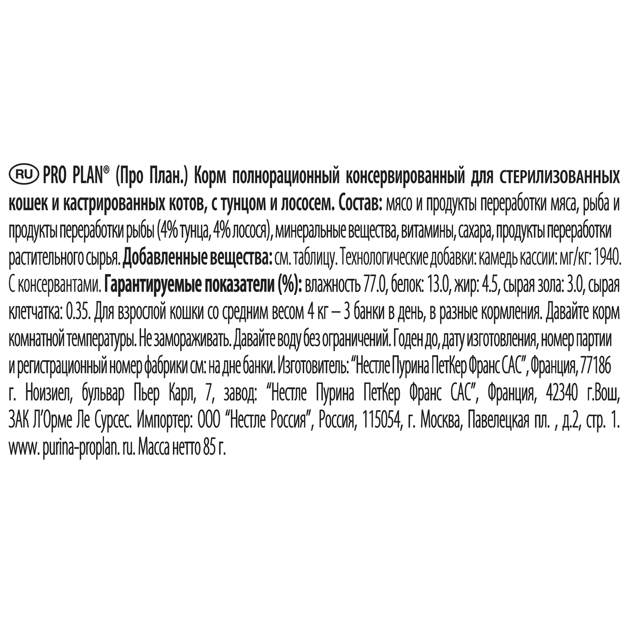 Влажный корм PURINA PRO PLAN для стерилизованных кошек и кастрированных котов с лососем и тунцом банка, 85 г поддерживает иммунную систему питомца, благоприятно влияет на его самочувствие. Он положительно воздействует на функции мочеполовой системы, оптимизирует показатели веса и защищает организм котов любой породы от инфекций и вирусов. В состав корма входит высокий процент антиоксидантов, самый активный из которых — витамин Е. Источник углеводов в виде мяса, пшеницы и риса улучшает самочувствие питомцев и придает им жизненную энергию. Также продукт содержит мясо, экстракты растительных белков, предающих энергию животному. Благодаря минеральным компонентам, клетчатке, растительным жирам, витаминам кошка получает все необходимые вещества для нормального функционирования внутренних органов после стерилизации или кастрации. Включая корм в рацион, у животного заметно улучшается состояние шерсти, зубной эмали и когтей. Подобное кормление становится отличной профилактикой заболеваний желудочно-кишечного тракта, мочевыводящих путей, почек, печени, препятствует нарушению обмена веществ. Влажный корм представляет собой мягкие кусочки небольшого размера в жидкой подливе с насыщенным ароматом. Для взрослого питомца весом до 4-6 кг ежедневный рацион состоит из трех паучей в сутки, которые необходимо разделить на два кормления. Содержимое пакетов подается при температуре 18-20С. Рядом с миской должна всегда находиться вода для питья. Продукт приготовлен по запатентованной технологии Nestle и безопасен в ежедневном рационе питомцев. Он производится американской компанией на заводах Европы, России. Приобрести влажный корм PURINA PRO PLAN для стерилизованных кошек и кастрированных котов с лососем и тунцом банка, 85 г можно в торговом центре METRO.