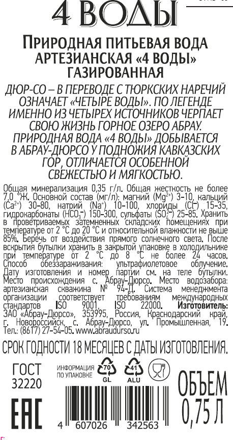 Вода Абрау Дюрсо 4 воды газированная, 750мл x 6 шт отличается повышенной мягкостью. Ее добывают из источника у черноморской бухты Дюрсо, в предгорьях Северного Кавказа, чем обусловлено богатое содержание в ней магния, кальция и натрия. Эта артезианская газированная вода первой категории имеет ненавязчивый вкус и прекрасно утоляет жажду.