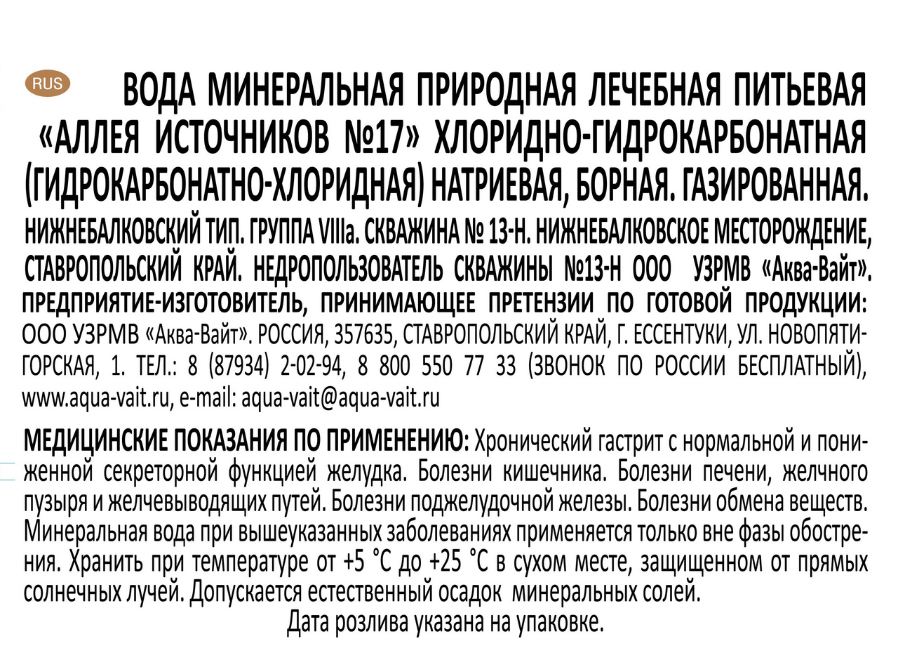 Аллея Источников 17 - минеральная природная питьевая лечебная вода. Применяется при хронических гастритах с нормальной и пониженной секреторной функцией желудка, болезнях кишечниках, печени, желчного пузыря и желчевыводящих путей, заболеваниях поджелудочной железы и обмена веществ (сахарный диабет, ожирение).
