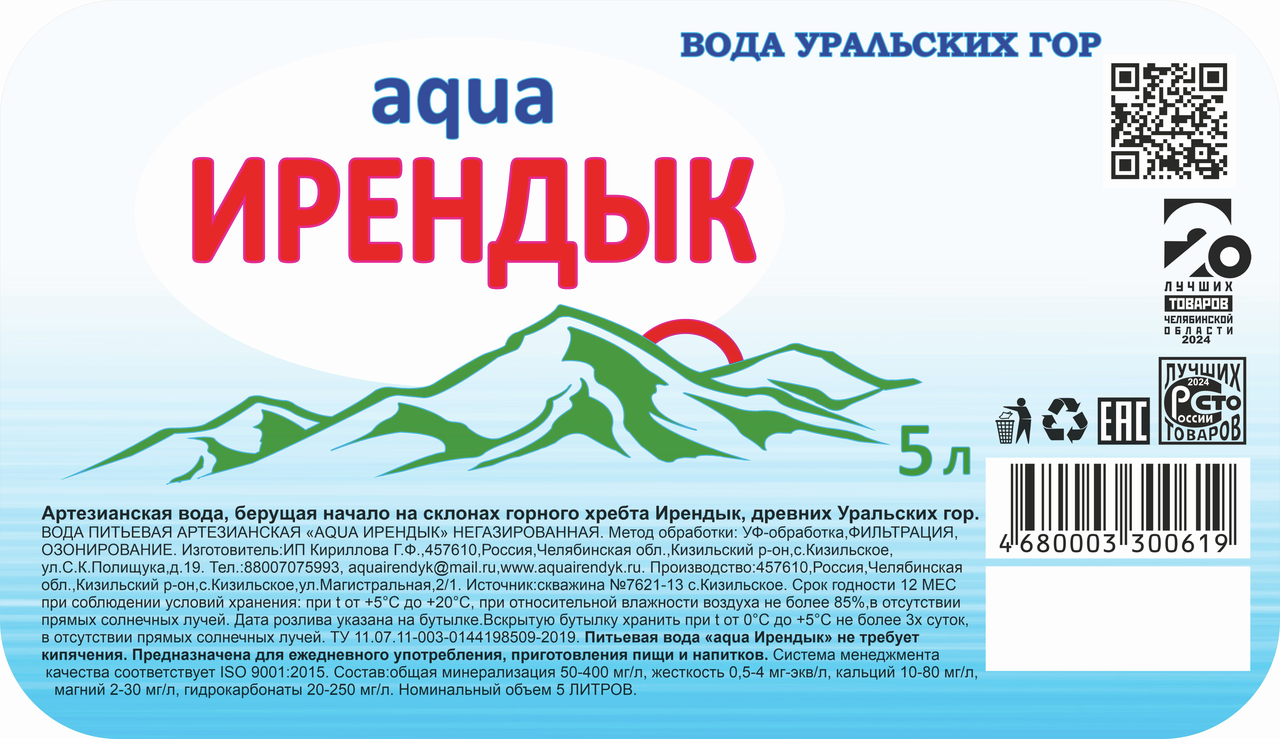 Вода Aqua Ирендык Артезианская негазированная, 5л
