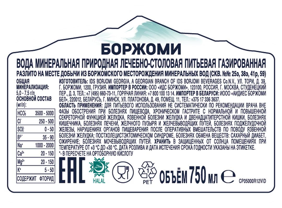 Вода Borjomi минеральная природная лечебно-столовая газированная, 750мл x 6 шт - легендарная грузинская минеральная вода с природным минеральным составом и мягкой газацией. Её уникальный, сбалансированный вкус - идеальное сопровождение к еде в любое время дня, от завтрака до позднего ужина. Минеральная вода Borjomi прекрасно дополняет блюда, помогая создать баланс вкусов и сохранить ощущение комфорта после еды. Borjomi подходит как к домашним блюдам, так и к ресторанной кухне, отлично вписываясь в ежедневный рацион.