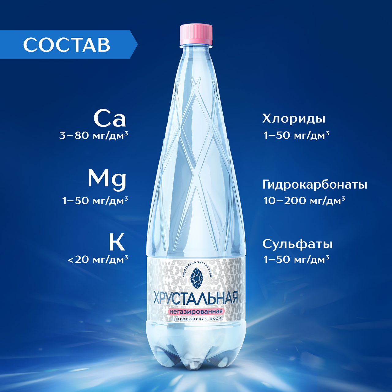 Вода Хрустальная негазированная, 1.5л - это не просто питьевая вода, а эстетичное и утонченное решение для повседневной заботы о вашем здоровье. Это высококачественная питьевая природная вода, прошедшая специальную очистку, чтобы предложить вам идеальный мягкий вкус и полезные свойства. Натуральная минеральная вода с ледников Предгорий Кавказа, которая проходит естественную природную фильтрацию и образует Апшеронский водоносный комплекс на глубине 208 метров. При помощи инновационных технологий вода бережно поднимается по нержавеющим трубам без доступа кислорода, сохраняя при этом свою уникальную природную структуру. Вода идеальна для повседневного употребления.