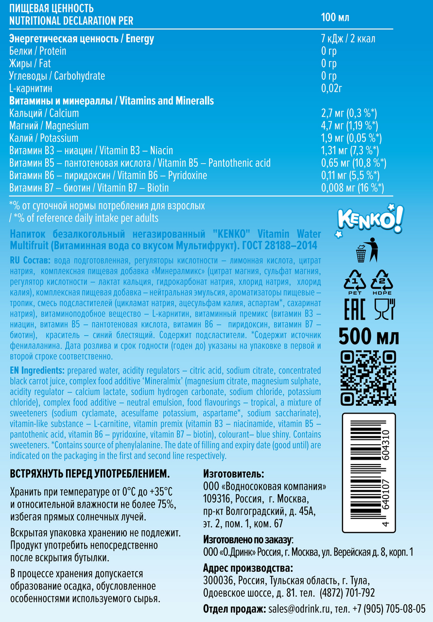 Вода Kenko! витаминная мультифрукт негазированная, 500мл