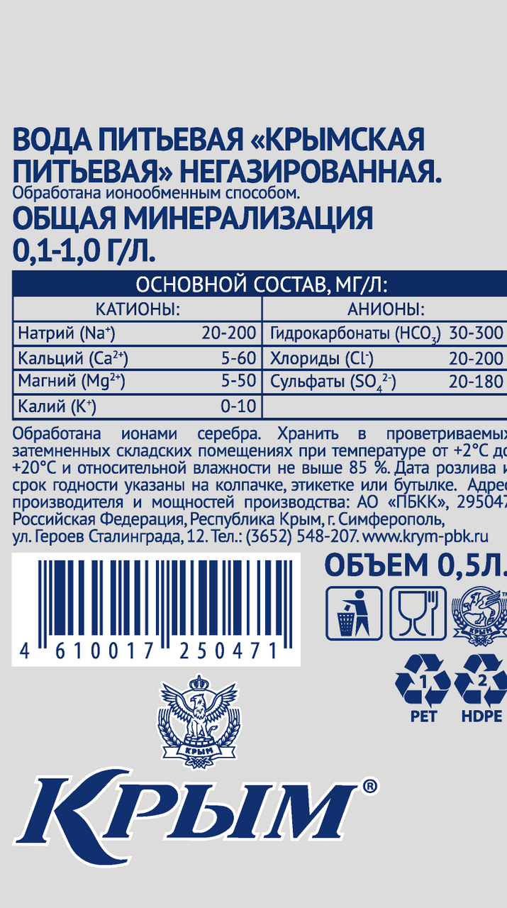 Комбинат Крым подготовил для всех, кто заботится о своем здоровье и о здоровье своей семьи, столовую воду для ежедневного употребления Крымская питьевая. Этот продукт проходит несколько степеней очистки и умягчения. Поэтому Крымская питьевая имеет мягкий вкус без выраженных привкусов минерализации. Крымская питьевая расфасовывается в емкости разного объема - от 0,5 л до 5 л - и в тару 18,9 литра. Любимые кофе или чай, приготовленные на воде Крымская питьевая, в полной мере раскроют свой аромат, станут еще полезнее и вкуснее. Идеально подходит для ежедневного употребления как взрослым, так и детям с 3-х лет, благодаря сбалансированному минеральному составу и невысокой минерализации. На ней можно готовить.