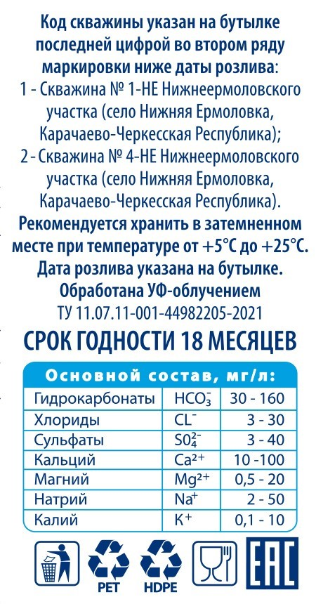 Гидрокарбонаты 160мг, Хлориды 3мг, Сульфаты 20мг, Кальций 10мг, магний 20мг, Натрий и Калий 2 и 50мг.