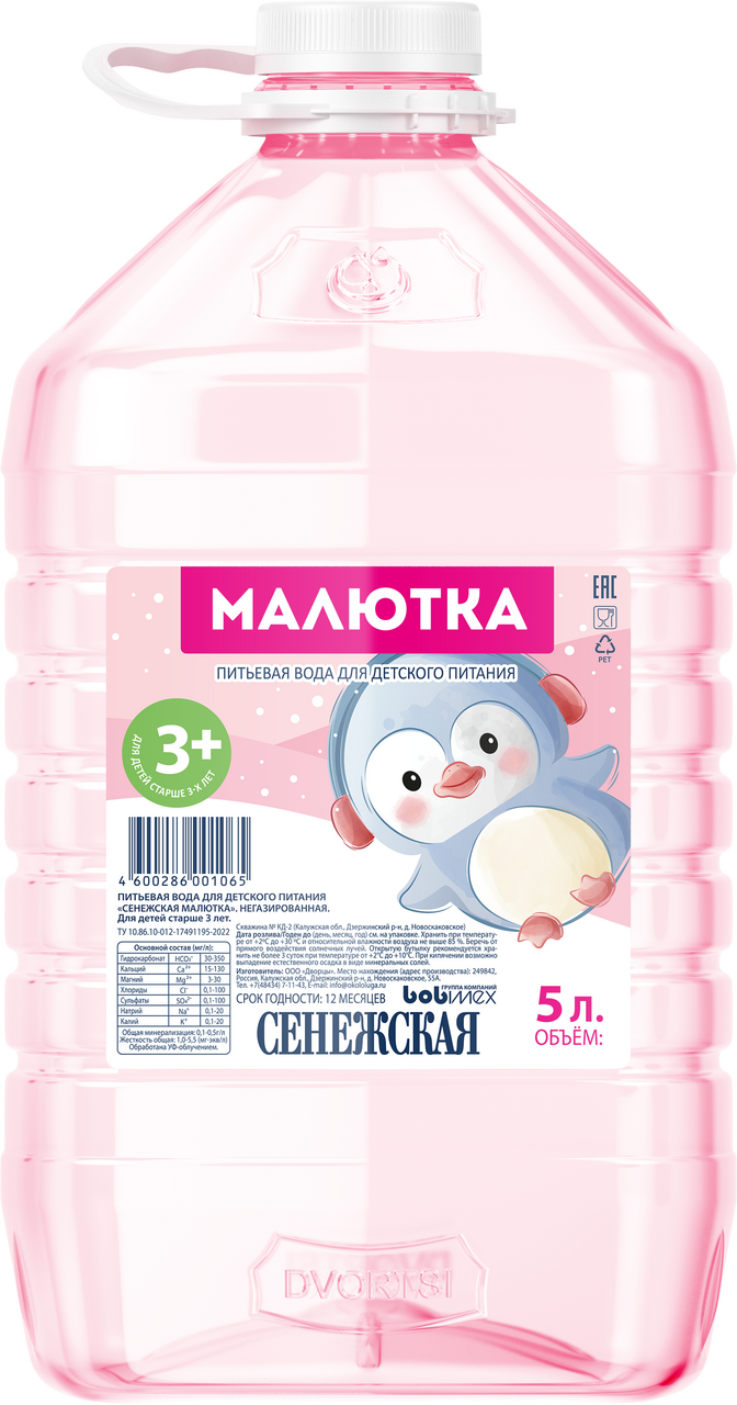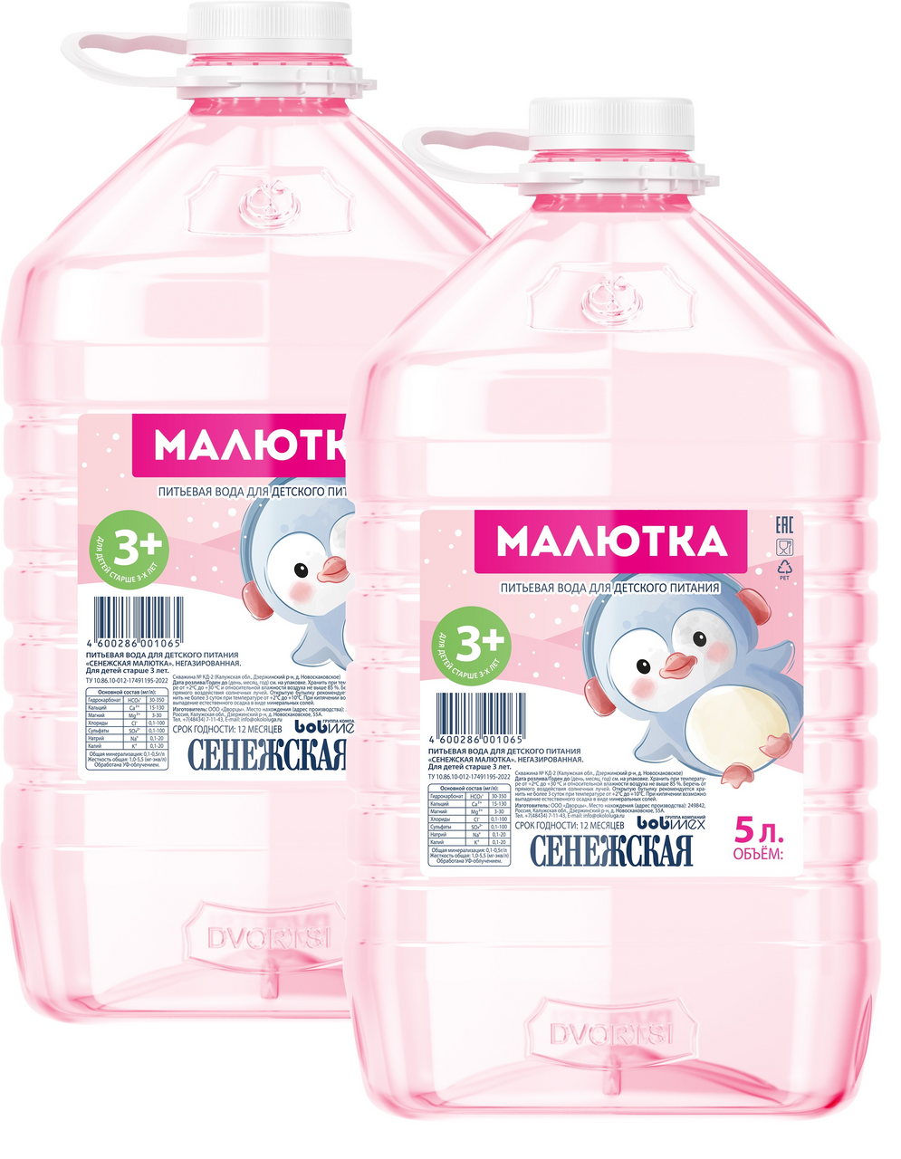 Вода Сенежская Малютка, 5л x 2 шт - в Малютке присутствуют все необходимые минералы и вещества, необходимые для развития ребёнка. Исключены все избыточные элементы, которые могут оказать негативную нагрузку на организм детей. Эта вода успешно прошла все обязательные испытания в аккредитованных лабораториях.