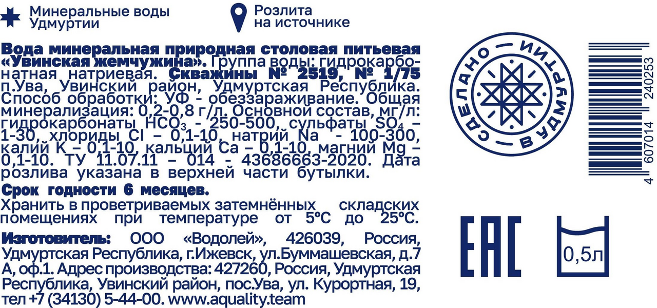 Увинская Жемчужина – негазированная минеральная вода, прекрасно утоляет жажду и отличается неповторимым мягким вкусом. Вода добывается из подземного озера, расположенного на глубине 130 метров в п. Ува (Удмуртия). Благодаря своему природному составу Увинская Жемчужина помогает укрепить иммунитет, улучшить пищеварение. Она бодрит, освежает и дарит заряд энергии на весь день. Пейте Увинскую Жемчужину и следите, как меняется к лучшему Ваше здоровье.
