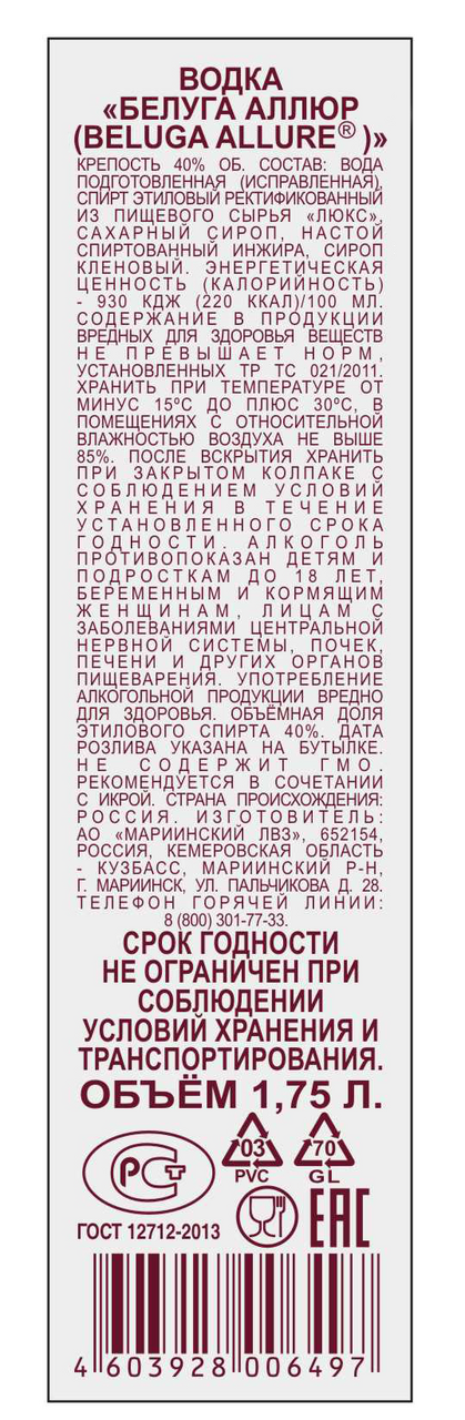 Превосходная элитная водка с изысканным, аристократическим характером. Вдохновением для создания этого продукта послужили неоднократные победы группы Белуга Поло Тим на масштабных международных соревнованиях в таком виде спорта как конное поло. Мастерами компании Синергия был разработан уникальный рецепт на основе чистейшей, прохладной воды, высококачественного зернового спирта, кленового сиропа и инжирной настойки. Благородство и уникальность водки Белуга Аллюр очень тонко подчеркнуты стильной бутылкой.