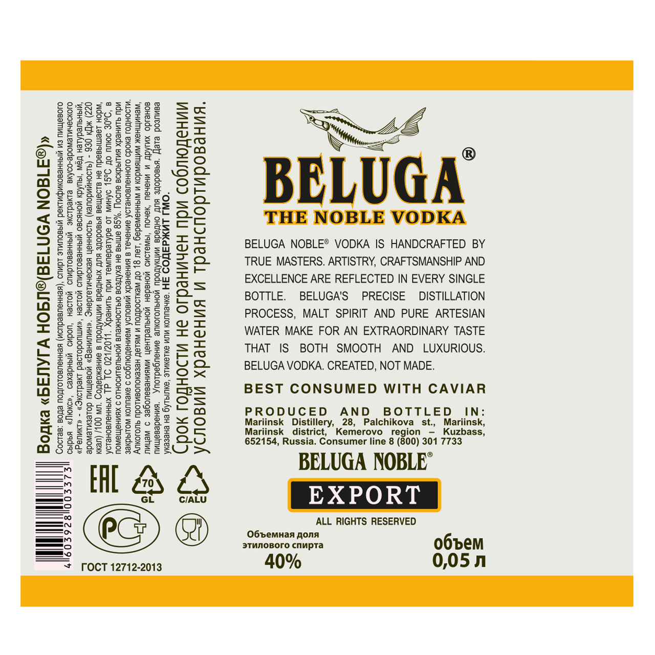 Beluga Noble (Белуга Нобл) - флагманский продукт в семье бренда Beluga (Белуга). Этот авторский напиток приобрел статус классик. Первая партия Beluga Noble Russian Vodka была выпущена в 2002 году. Это стало возможным благодаря результатам кропотливой работы мастеров Мариинского ликеро-водочного завода, основанного в 1900 году. Основу продукта составляют ингредиенты высочайшего качества, кропотливый труд мастеров, их пристальное внимание к каждой детали и непрерывный контроль производства. Водка Beluga активно развивается на экспортных рынках в Европе, Азии, США, Латинской Америке, Ближнем Востоке и продаётся более чем в 75 странах, а также в 220 аэропортах по всему миру. Beluga Group (Белуга Групп) — крупнейший производитель алкогольной продукции на рынке России. Продукция предприятия представлена в 70 странах мира, а главный офис компании располагается в Москве. Широчайший ассортимент включает продукцию многих известных брендов, среди которых Мягков, Беленькая, Государев заказ, Beluga, Veda и бренди Золотой Резерв. Все производственные мощности компании оборудованы согласно современным стандартам и технологиям. Общая производительность предприятия составляет более 15 миллионов декалитров. Успех компании и профессионализм ее команды обеспечил Beluga Group топовые позиции во многих отечественных рейтингах.