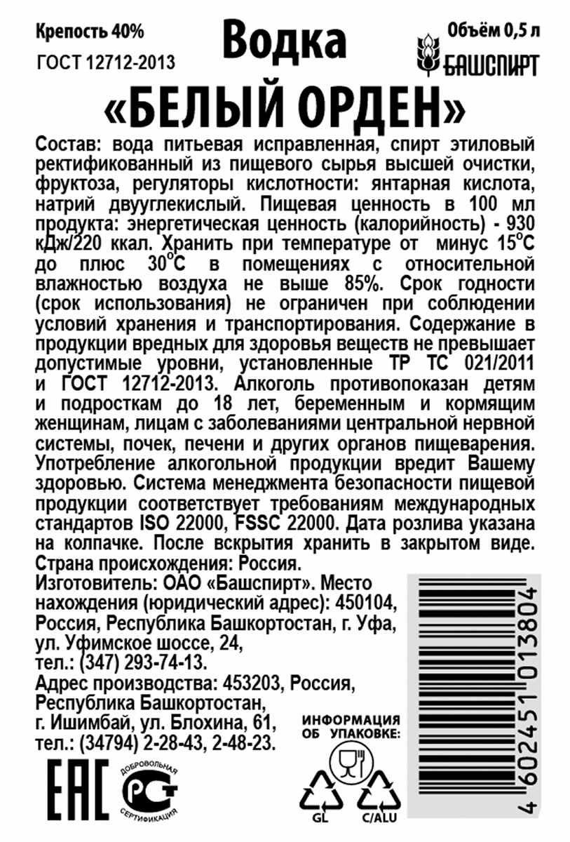 Водка Белый орден изготавливается на спирте высшей очистки. В составе также янтарная кислота и фруктоза. Напиток для хорошей компании. Перед подачей рекомендуется хорошо охладить.