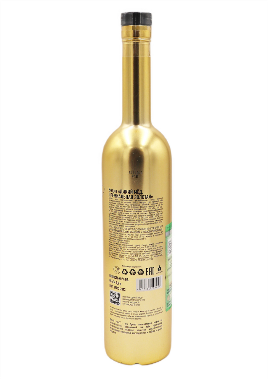 Водка "Дикий мед" Премиум изготовлена по оригинальной рецептуре в стиле старинных русских традиций на основе высококачественного зернового спирта класса "Альфа" и специально очищенной воды с добавлением спиртовой настойки липового цвета, натурального липового и бортевого меда. Уникальный бортевой мед собирается дикими пчелками "бурзянками" в резервате дикой природы государственного заповедника "Шульган-Таш". Мед придает вкусу водки деликатность, нежность и сладковатое послевкусие. Водка "Дикий мед" хорошо сочетается с большинством блюд русской кухни и мясными закусками.