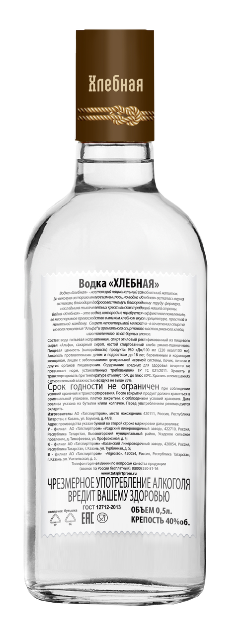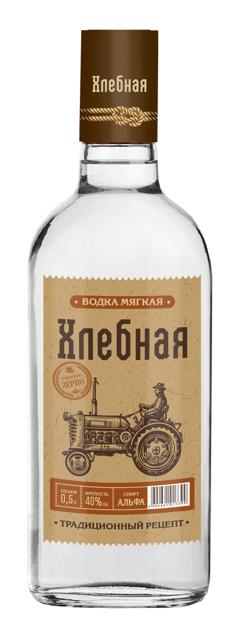 Водка Хлебная, 0.5л кристально чистого, прозрачного цвета обладает согревающим, сбалансированным, тонким вкусом. Аромат водки чистый, классический, с утонченными нюансами свежего ржаного хлеба. Водку рекомендовано употреблять в паре с блюдами русской кухни, разнообразными соленьями и холодными закусками.