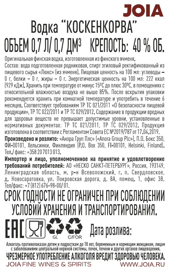 Классическая финская водка, которая производится из отборного ячменя иместной родниковой воды. Водка проходит многократную дистилляцию, благодаря чему она приобретает мягкий, гармоничный вкус с легкими лакричными нюансам.