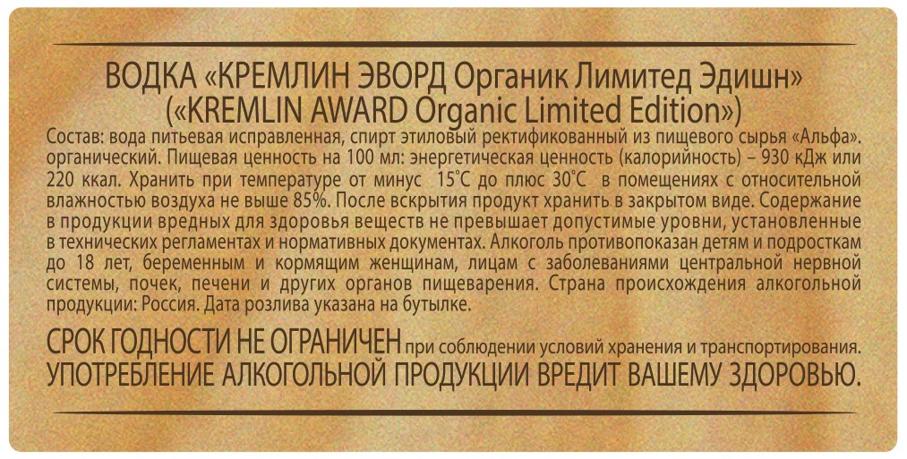 Водка Kremlin Award Organic Limited Edition изготавливается из спирта, полученного в результате перегонки перебродившего сусла из лучших сортов органической пшеницы. Пшеница выращивается без использования каких-либо химических удобрений. Чистейшая артезианская вода, используемая в производстве, проходит 7 степеней очистки, в том числе через нано-фильтр. Водка обладает чистым, свежим вкусом с мягкой текстурой, благодаря чему очень легко пьется. Крепкий напиток лучше всего употреблять хорошо охлажденным в качестве аперитива или в сопровождении закусок, горячих и холодных мясных блюд, а также овощей.