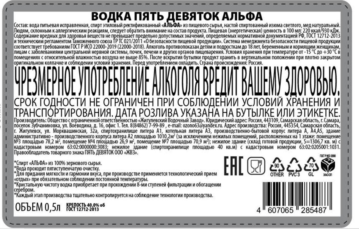 Водка Пять девяток Альфа, 0.5л состоит из 100% зернового сырья. Вода проходит пятиступенчатую очистку. Для придания мягкости и гармонии вкуса, при производстве применяется технологический прием Отдых при обязательном соблюдении постоянной температуры. Кристальную чистоту водку при прохождении 8-ми ступеней фильтрации и обогащения серебром. Имеет мягкий спиртовой вкус. В состав рецептуры напитка входит настой овсяных хлопье�� и настой ржаных сухарей, что придает напитку утонченный, гармоничный вкус и долгое послевкусие.
