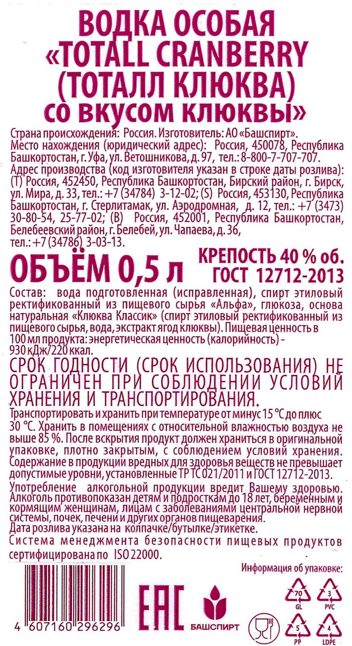 Экологически чистый продукт, в производстве используется только чистая вода и натуральное сырье, отсутствие красителей. Наш девиз: Чистая. Честная. Натуральная. Прозрачный напиток. Освежающий аромат с тонкими нотками клюквы. Мягкий чистый вкус повторяет аромат. Рекомендуется подавать в качестве дижестива, или в составе коктейлей.