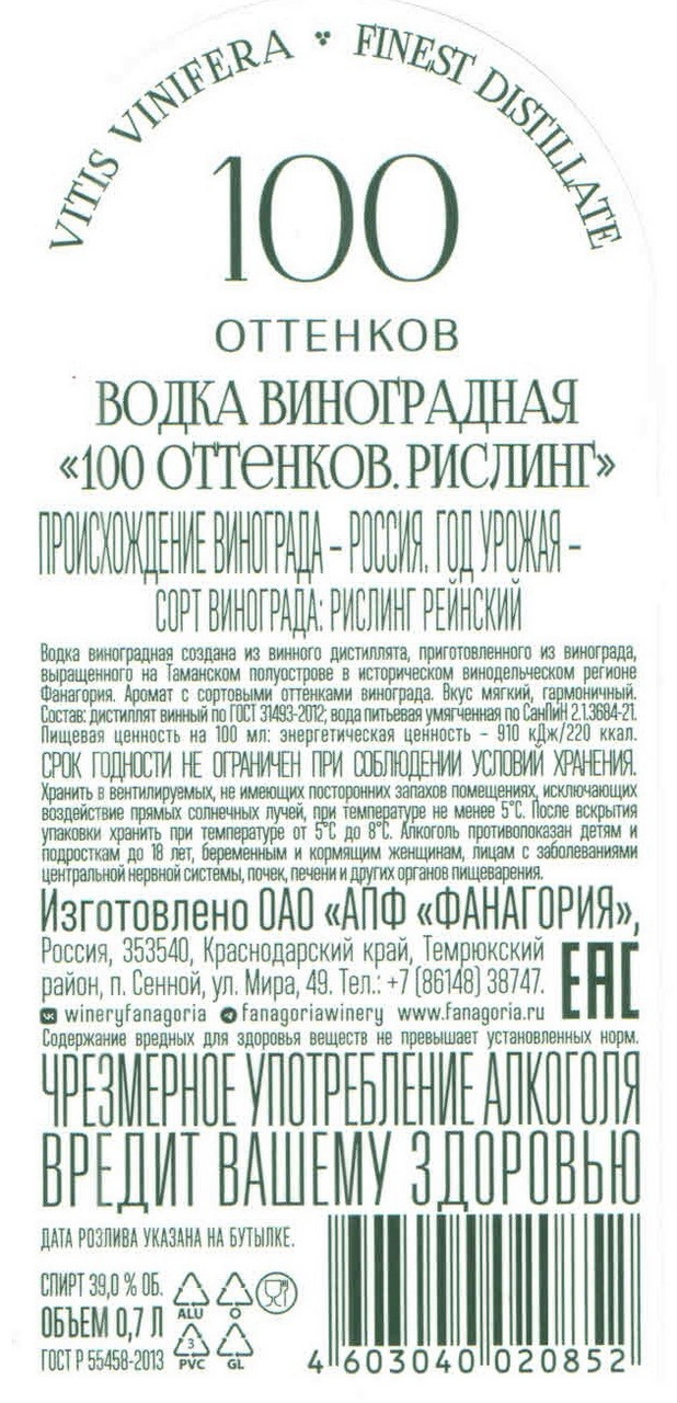 Водка виноградная Fanagoria 100 оттенков Рислинг, 0.7л