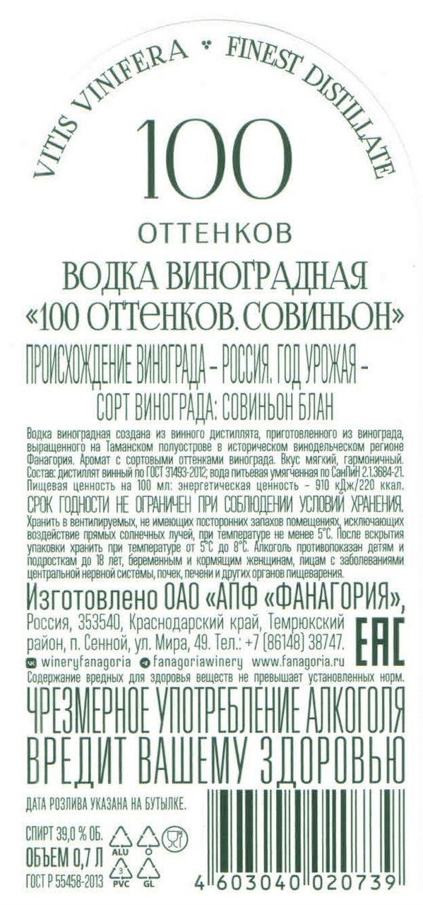 Водка виноградная Fanagoria 100 оттенков Совиньон, 0.7л