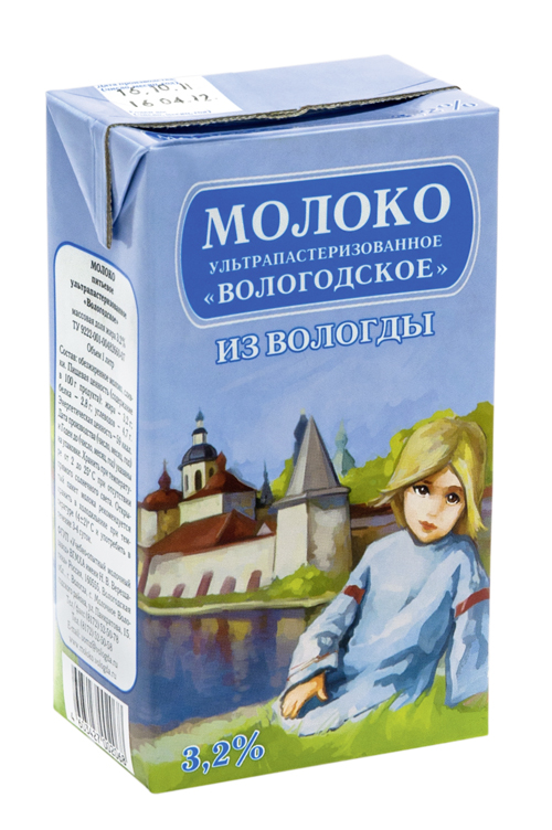 Молоко питьевое стерилизованное Вологодское. Массовая доля жира- 3,2%. Объем: 1 л. Состав: обезжиренное молоко, сливки. Пищевая ценность: жира -3,2 гр, белка- 2,8 гр, углеводов- 4,7 гр. Энергетическая ценность 59 ккал. Открытый пакет молока рекомендуется хранить в холодильнике, при температуре 4+/- 2С и употребить в течение 3-4 суток.
