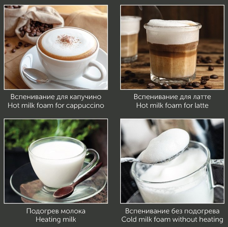 Мощность - 500Вт - 600Вт.Материал корпус - пластик. Тип привода - магнитный. Контроллер Strix.Антипригарное покрытие. Режимы работы: вспенивание молока для капучино, вспенивание молока для латте, подогрев молока без вспенивания, вспенивание молока без подогрева. Объем для вспенивания - 110мл.Общий объем - 200мл. Устройство для вспенивания молока для приготовления молочно-кофейных напитков. Имеет 4 режима работы, с помощью которых вы сможете приготовить любой желаемый кофе с молочной пенкой. Прибор оснащен функцией автоматического отключения и контроллером Strix, который предотвращает перегрев молока. Благодаря чему при подогреве молока обеспечивается его идеальная температура.