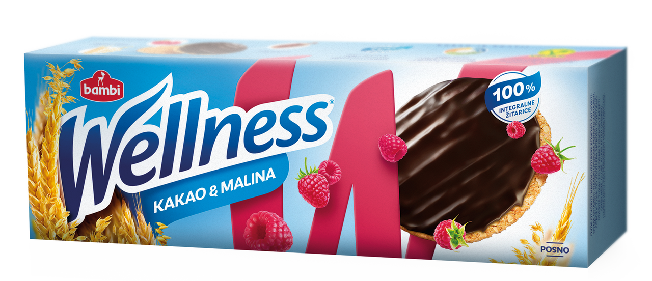 Wellness идеально подходит для завтрака или перекуса в течение дня. Печенье состоит из натуральных ингредиентов, а также из 100% цельного зерна, которое является естественным источником клетчатки, витаминов и минералов. Это отличный выбор, если вы придерживаетесь сбалансированного питания, а также подходит для вегетарианцев. Злаковое печенье с наполнителем. Сочная какао-начинка и пряный малиновый вкус в сочетании с цельнозерновым бисквитом