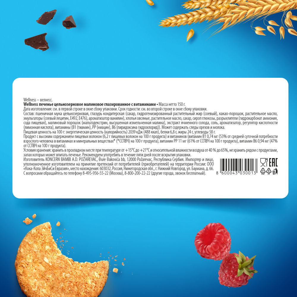 Печенье Wellness цельнозерновое глазированное малиновое с витаминами, 150г