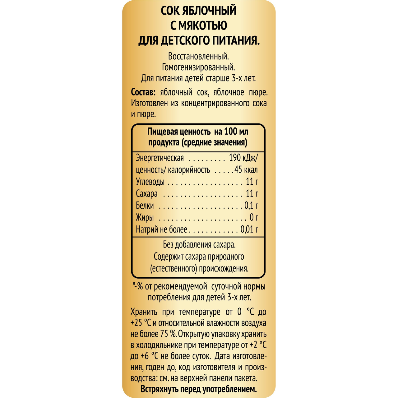 Cостав короба: 12шт. Состав: яблочный сок, яблочное пюре Изготовлен из концентрированного сока и пюре. Пищевая ценность на 100г: углеводы 11г Энергетическая ценность: 45ккал/190кДж Хранить при температуре от 0С до +25С и относительной влажности воздуха не более 75% Срок годности: 12 месяцев